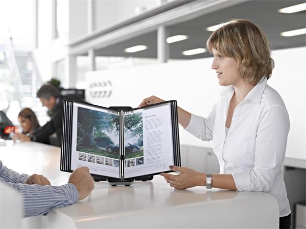 Komplett asztali bemutató rendszer stílusos kivitelben. Látványos forma kiváló minőségű anyagok jellemzik. Kerete szálcsiszolt alumínium, mely belseje puha tapintású, fekete, ABS műanyag. Egyszerűen összepattintható, szétszedhető. A kiszerelés tartalmazza a tartót, és a bemutatótáblákat is. A bemutatótábla műanyaggal bevont, acélhuzal kerete tartós és egyben rugalmas szegélyt eredményez. A fém forgócsapoknak köszönhetően a tartóba könnyen behelyezhető és kivehető. Alkalmas irodákban, recepciókon való használatra.