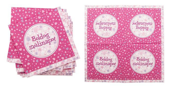 Szalvéta, 3 rétegű, 33x33 cm, "Boldog Születésnapot", rózsaszín